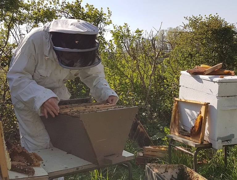 Alexandra est tombée dans l'apiculture dès son enfance. Son père, lui-même apiculteur, l'emmenait faire le tour des ruchers et lui a transmis sa passion. A 20 ans, Alexandra a suivi une formation et obtenu son diplôme à la SRABE (Société Royale d'Apiculture de Bruxelles et ses environs).En 2003, Alexandra s'installe à Braine-L'Alleud et y met ses premières ruches. Sa passion dévorante la pousse rapidement à augmenter le nombre de ses ruches, mais aussi à continuer à se former auprès d'autres apiculteurs et en participant à différentes conférences. Après quelques années, on lui propose d'intégrer des écoles d'apiculture où elles y donne encore des cours aujourd'hui. Très active dans sa commune, son amour pour les abeilles et son engagement pour l'environnement sont bien connus dans la région.